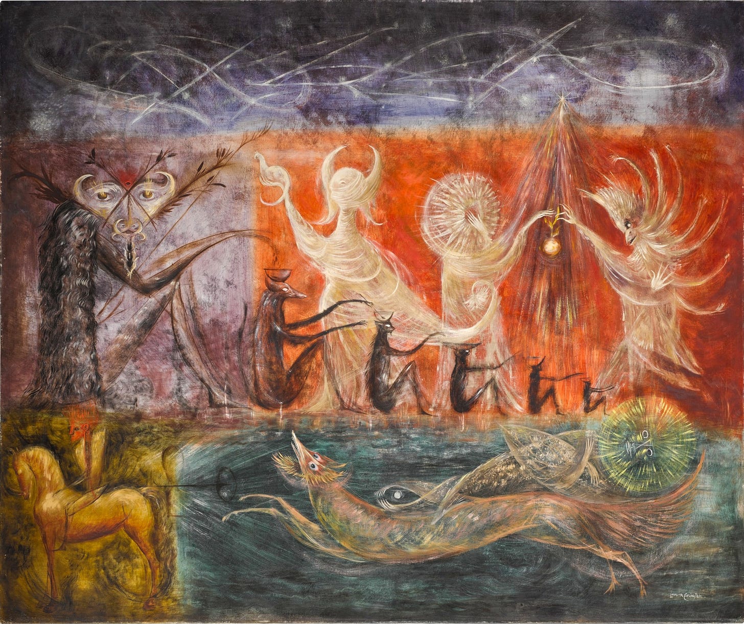 Αν με το Αποκάτω (1944) η Carrington επεδίωξε να ξορκίσει τις τρομαχτικές ―και προφανώς αβάσταχτα στοιχειωτικές― της εμπειρίες από την άγρια κατάβασή της down below στα όρια της τρέλας μέχρι να αγκυροβολήσει στην Αμερική και στη συνέχεια στο Μεξικό, στο Ακουστικό Κέρας (1976) όλο αυτό το βαρύ βίωμα, επεξεργασμένο πια και ιδωμένο από το ασφαλές περιβάλλον του Μεξικού γίνεται ―όπως είδαμε στο 1ο μέρος― γόνιμο έδαφος για μια σατυρική κριτική στο βαθειά ριζωμένο στην ιστορία πατριαρχικό και ανθρωποκεντρικό σύστημα που εκμεταλλεύεται γυναίκες και φύση, όπου η λύτρωση επέρχεται στους πάγους μέσα από τη γυναικεία συντροφικότητα.